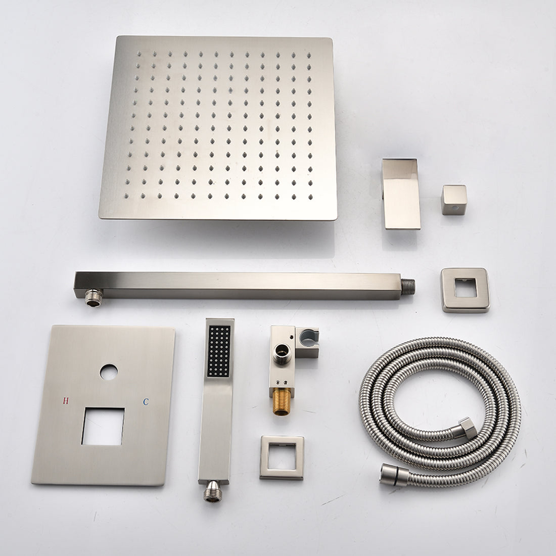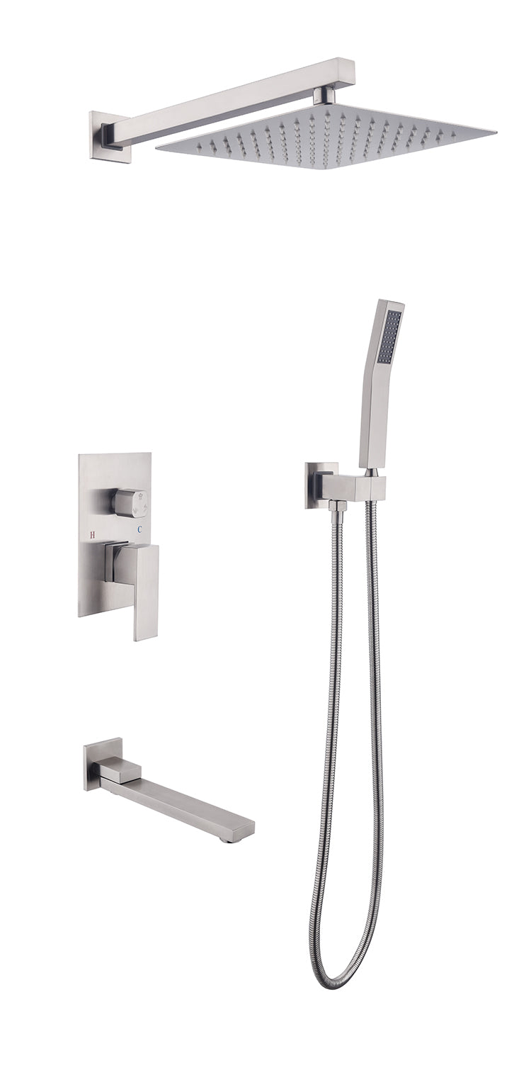 Wall Mounted Shower System Combo With Hand Shower, 16 Inch Shower Head And Tub Spout Brushed Nickel Brass
