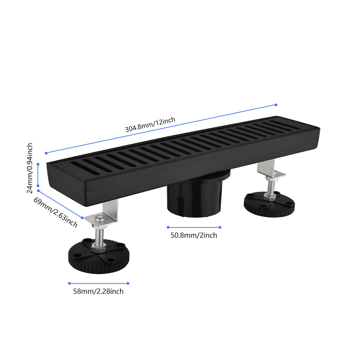 12 Inches Linear Shower Drain With Removable Quadrato Pattern Grate, 304 Stainless Shower Drain Included Hair Strainer And Leveling Feet Matte Black Stainless Steel