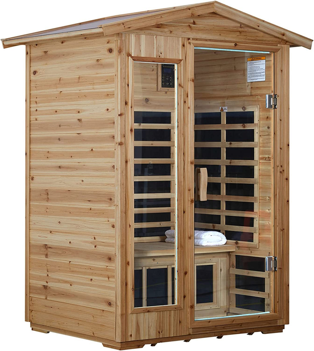 Two Person Far Infrared Khaya Wood Outdoor Sauna Room Natural Wood Wood Stainless Steel