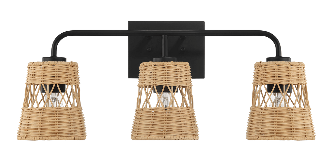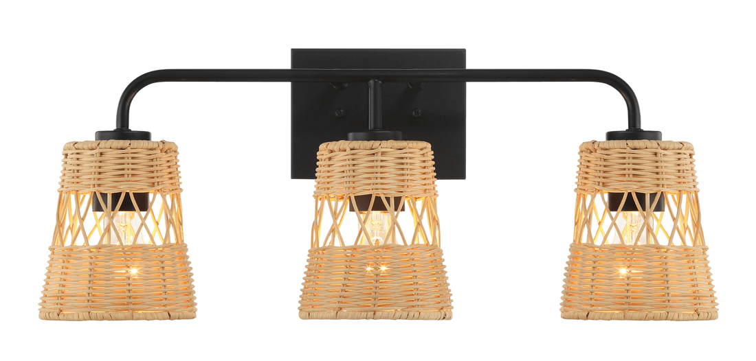 Moonlit Three Lights Wall Sconce With Rattan Shade, Bathroom Lighting Fixtures Over Mirror Black,Rattan Metal,Rattan