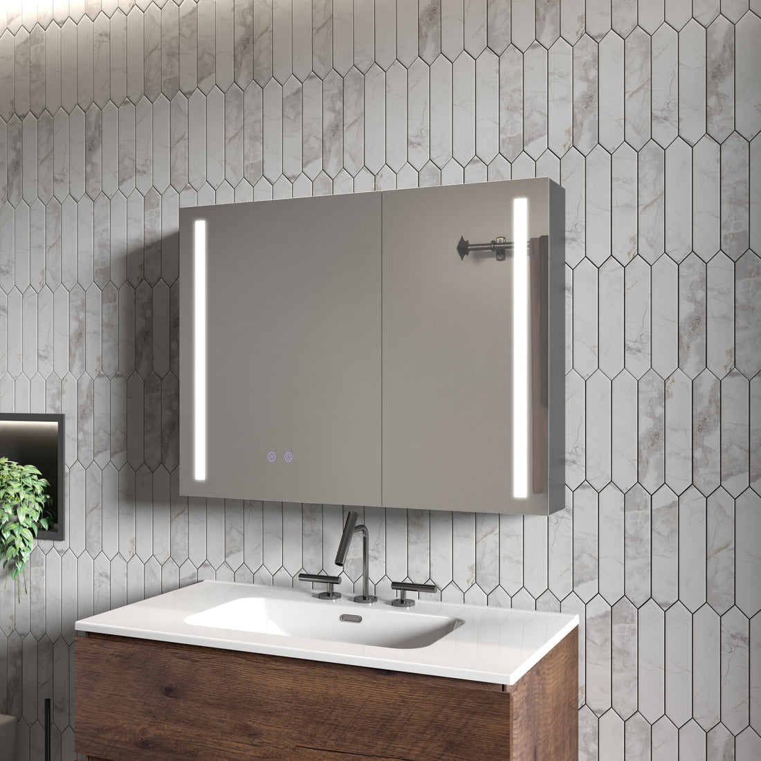 34" W X 26" H Modern Wall Mounted Led Frontlit Bathroom Mirror Cabinet With Us Standard Plug, Temperature Adjustable, Memory Touch Switch, Large Storage Silver Glass