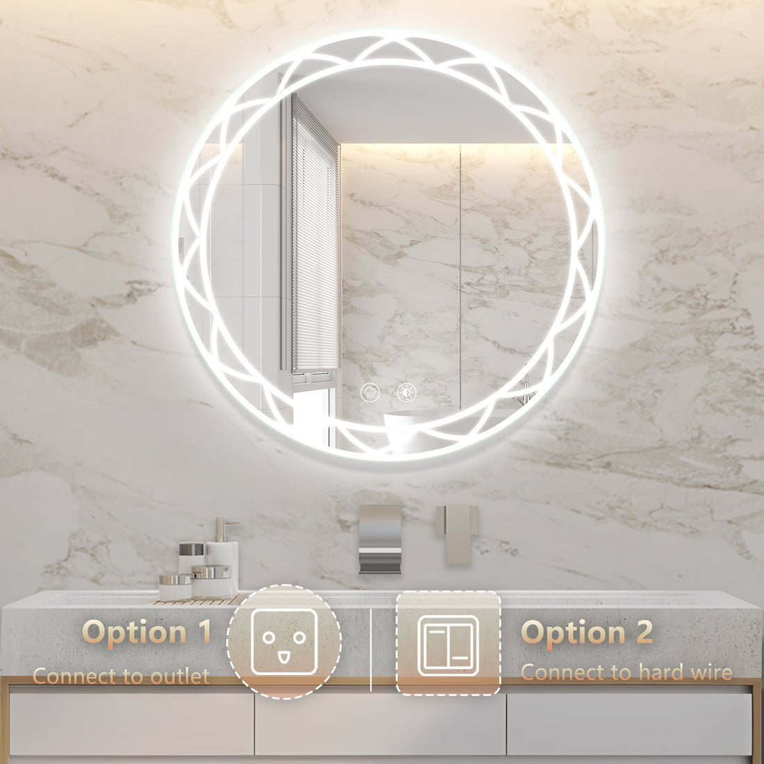 Name: Round Bathroom Mirror 24x24 inch Characteristics: Lighting Design Led round bathroom mirror uses a...