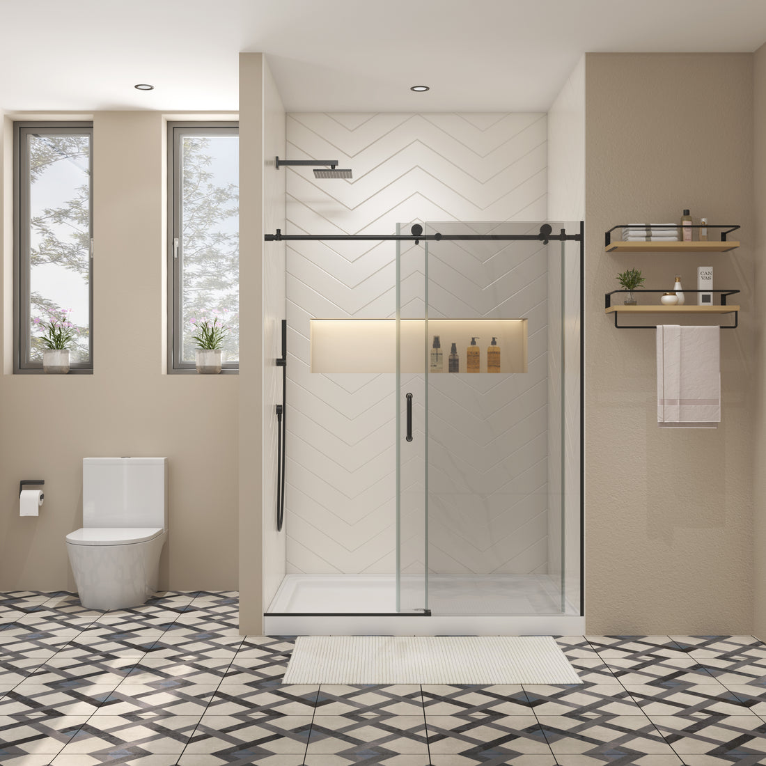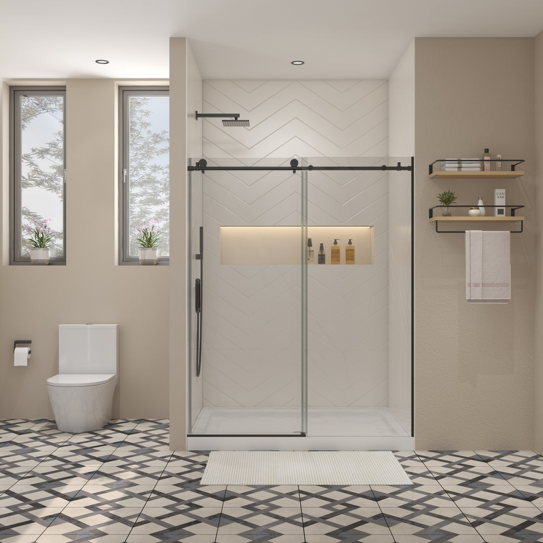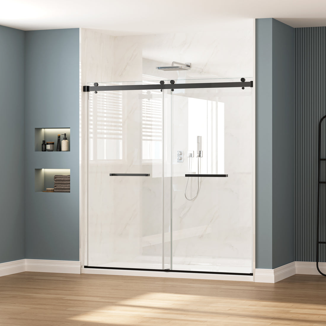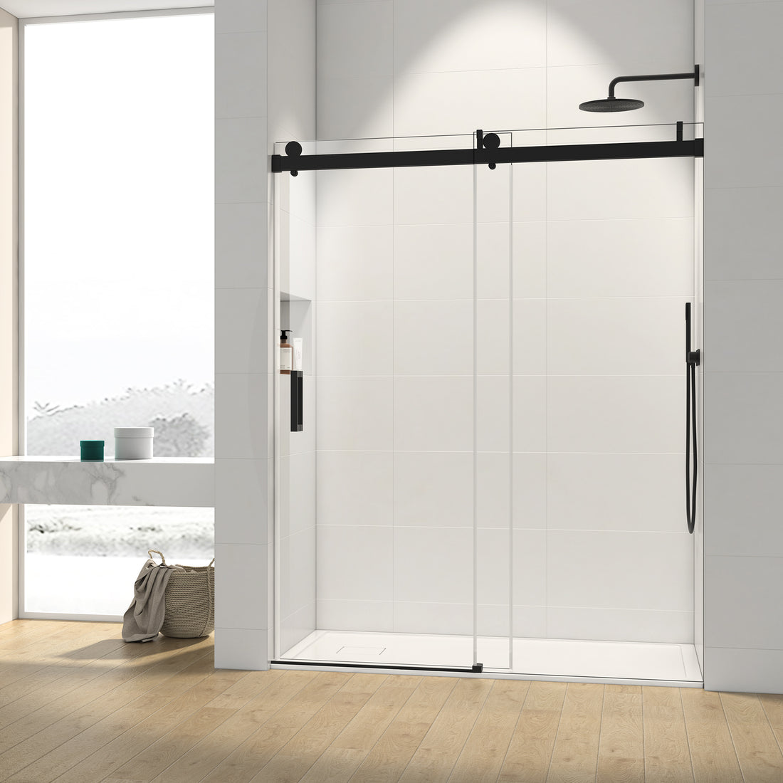 Frameless Sliding Shower Door 58 60 In. W X 76 In. H, Bathroom Sliding Door With 5 16" Clear Tempered Glass, Matte Black Finish, Designed For Smooth Door Closing Matte Black Stainless Steel