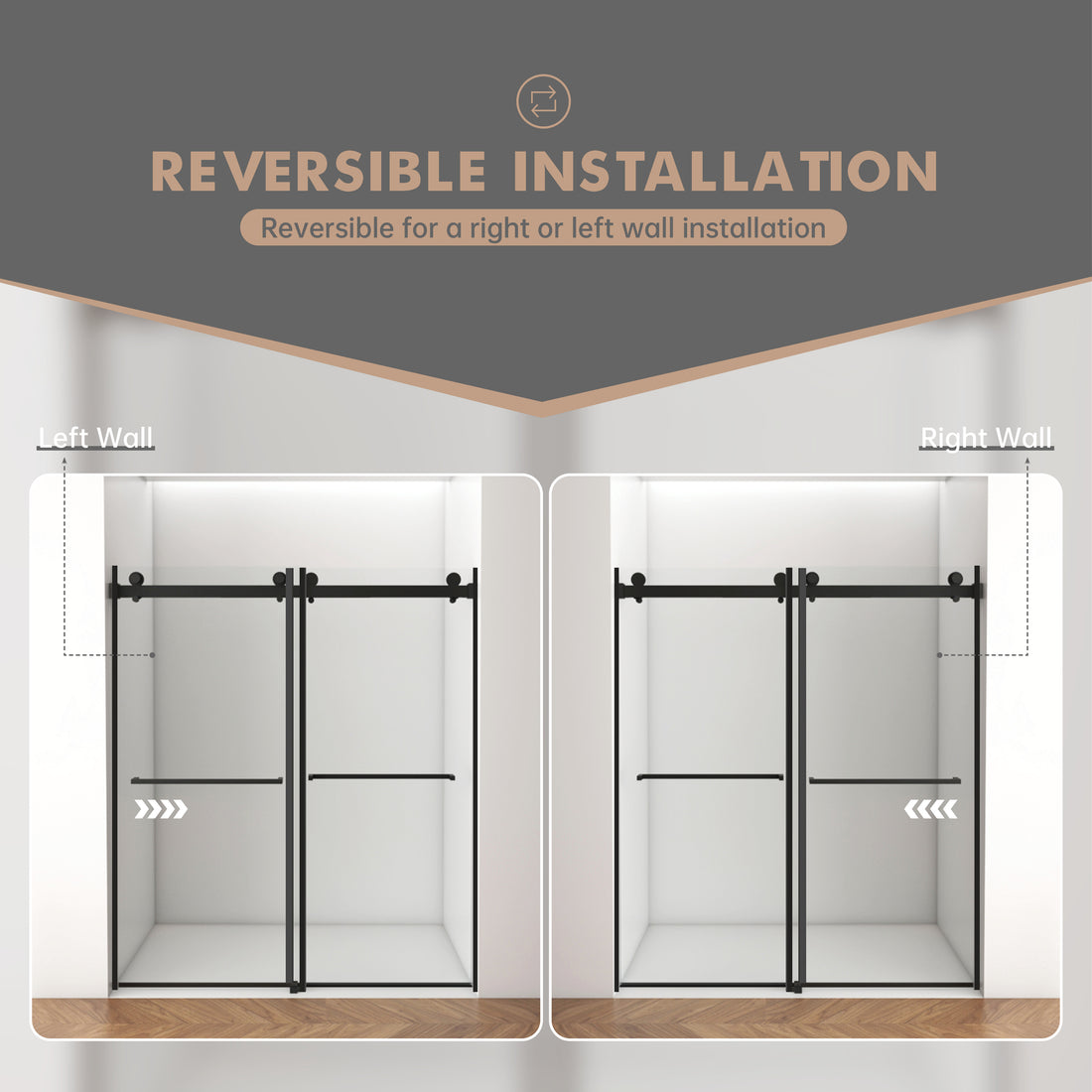 56" 60"W X 70"H Frameless , Double Sliding , 5 16" 8Mm Laminated Glass Premium Tempered Glass Shower Enclosure,Double Side Easy Clean Coat,Matte Black Finished With Buffer Matte Black Bathroom American Design Stainless Steel