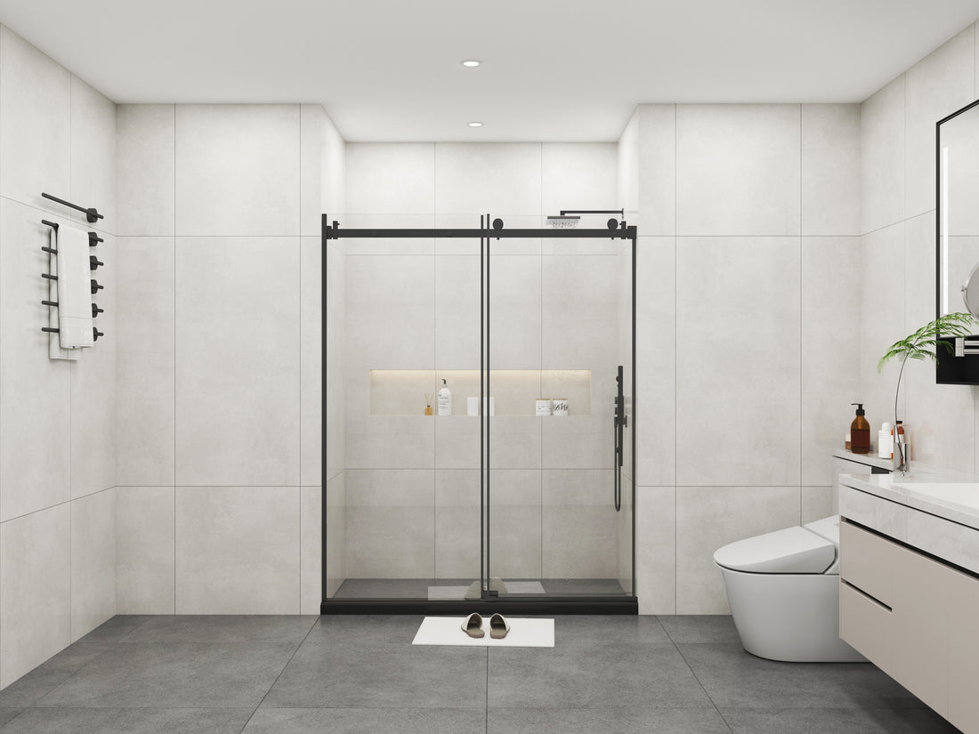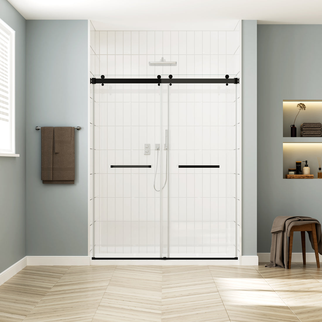 Frameless Double Sliding Shower, 57" 60" Width, 79" Height, 3 8" 10 Mm Clear Tempered Glass,Designed For Smooth Door Closing With Upgraded Crashproof System Technology Matte Black Finish Matte Black Glass