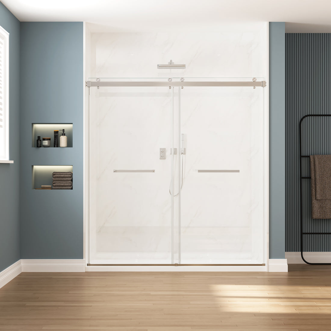 Frameless Sliding Shower Door 58 60 In. W X 76 In. H, Bathroom Sliding Door With 5 16" Clear Tempered Glass, Brushed Nickel Finish, Designed For Smooth Door Closing Brushed Nickel Stainless Steel