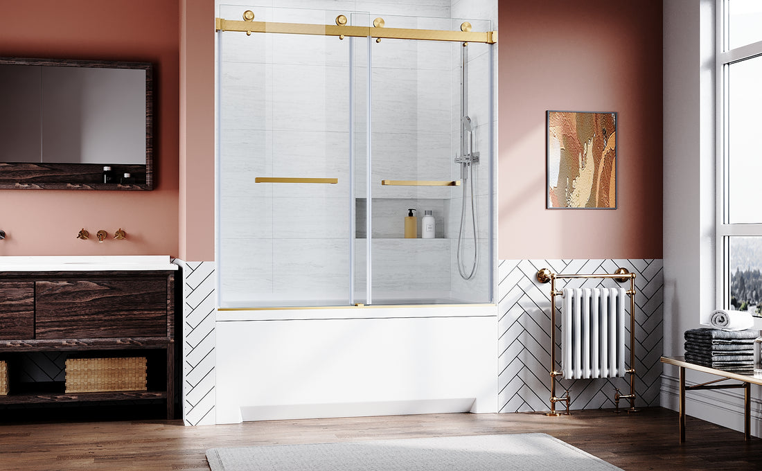 Frameless Sliding Bathtub Door 56 60 In.W X 62 In.H,Bypass Tub Glass Sliding Shower Doors,3 8" 10Mm Thick Clear Tempered Glass,Heavy Duty Stainless Steel Hardwares,2Pcs Rectangle Handles,Brushed Gold Brushed Gold Stainless Steel
