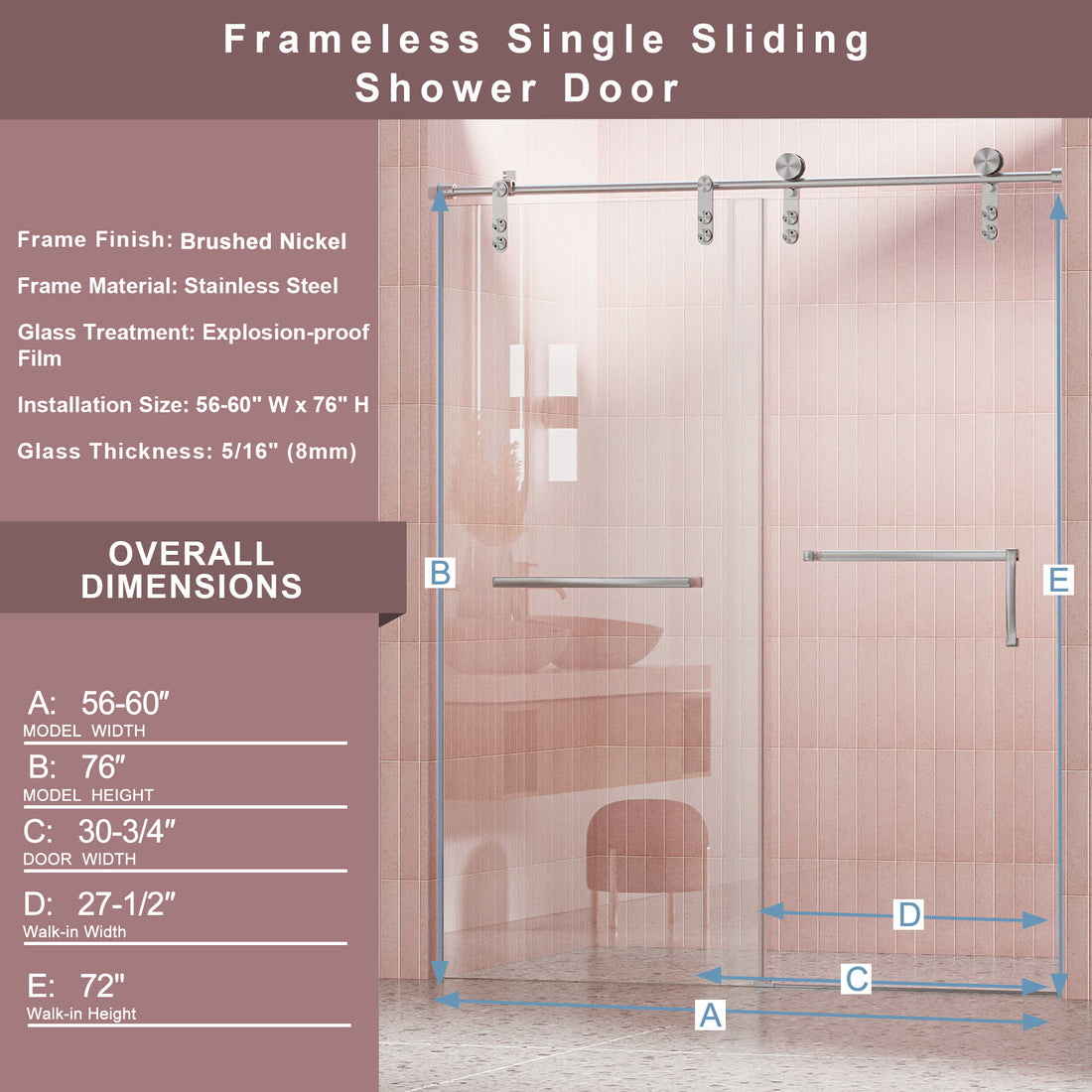 56 60 In. W X 76 In. H Frameless Shower Door, Single Sliding 5 16" 8Mm Clear Tempered Glass Shower Door With Explosion Proof Film, Stainless Steel Hardware, Brushed Nickel 24D210 60Bn Combo Brushed Nickel Tempered Glass