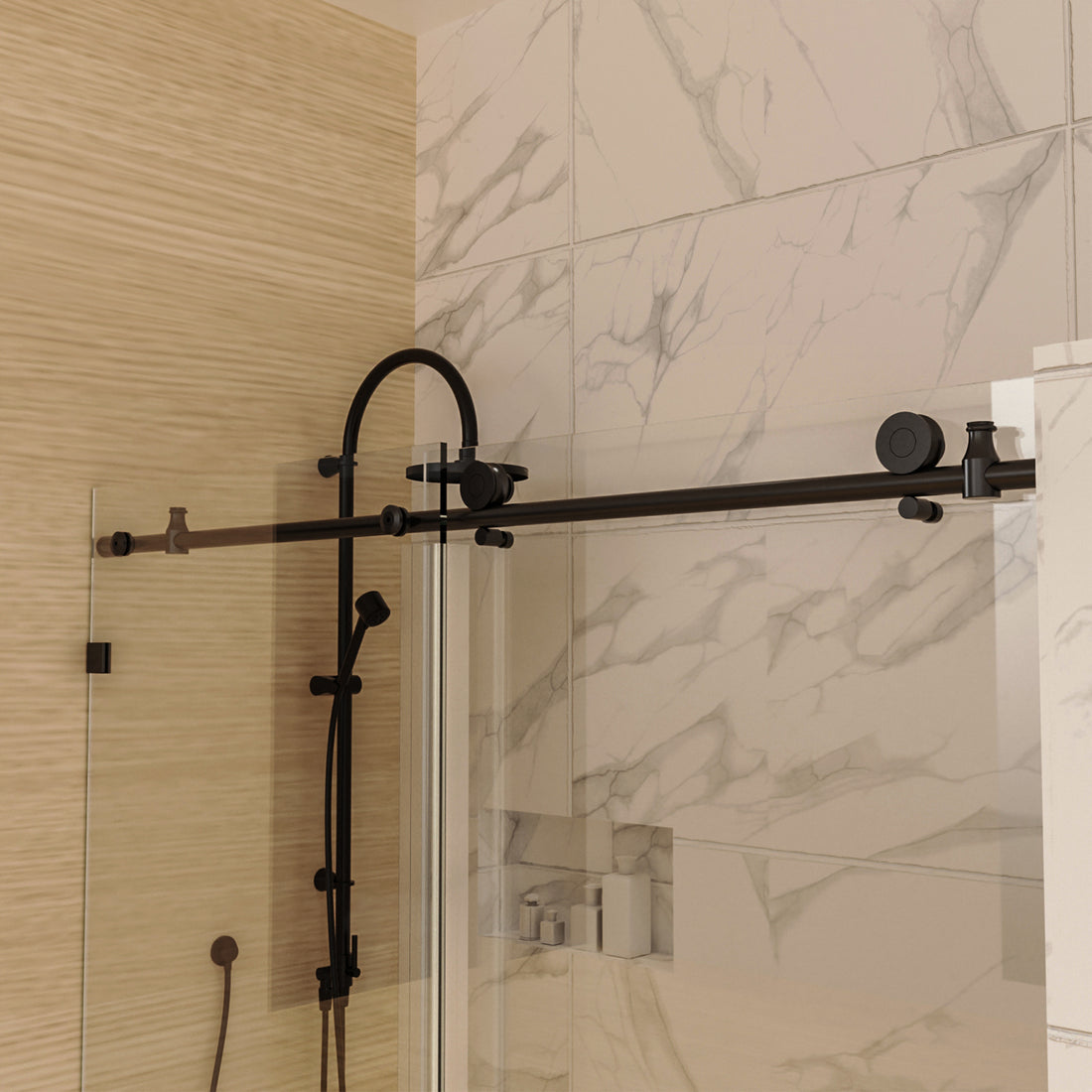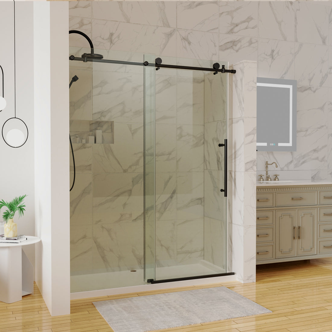 56'' 60'' W X 76'' H Single Sliding Frameless Shower Door With 3 8 Inch 10Mm Clear Glass In Matte Black Matte Black Stainless Steel