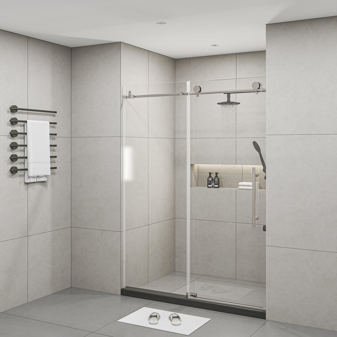 68 72" W * 76" H Frameless Single Sliding Soft Close Shower Doors With Buffer, Reversible Installation, 3 8" 10Mm Thick Sgcc Tempered Glass Door, Bathroom Sliding Shower Door, Brushed Nickel Finish Brushed Nickel Glass Metal