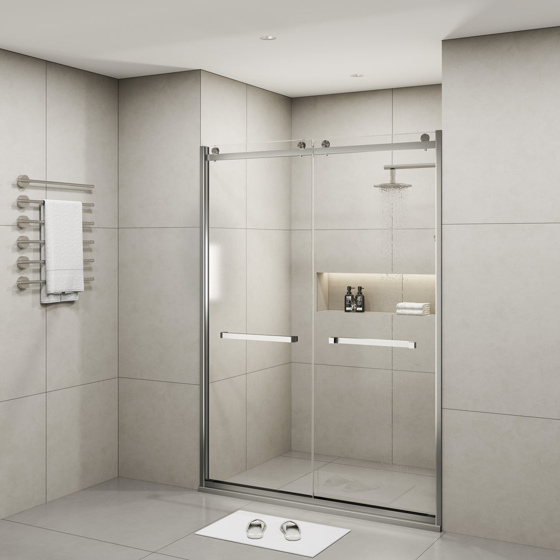 56'' 60'' W X 76'' H Single Sliding Frameless Shower Door With 3 8 Inch 10Mm Clear Glass In Chrome Chrome Stainless Steel
