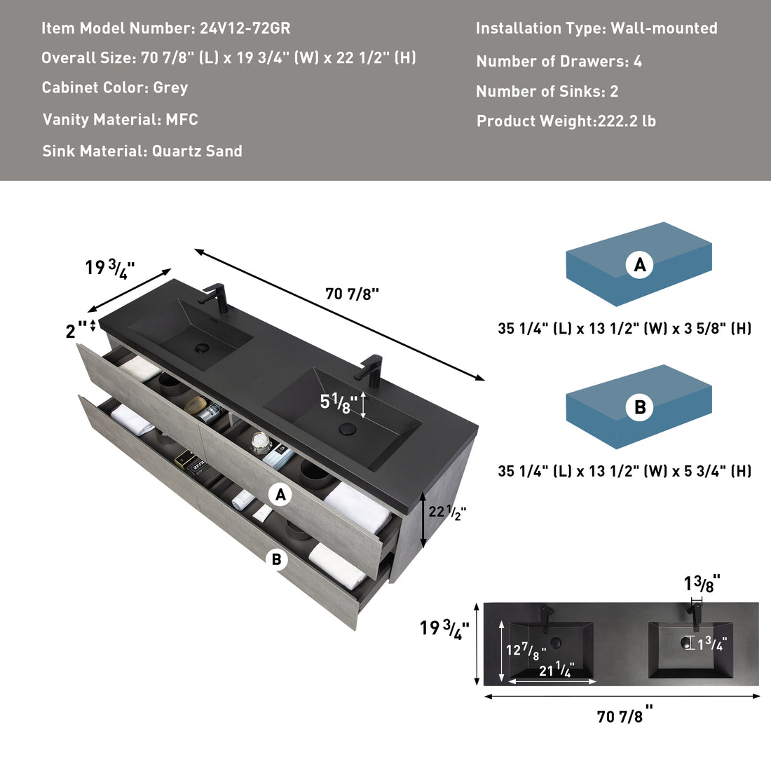 72" Floating Bathroom Vanity With Sink, Modern Wall Mounted Bathroom Storage Vanity Cabinet With Two Black Quartz Sand Top Basins And Four Soft Close Drawers, 24V12 72Gr Grey Grey Plywood