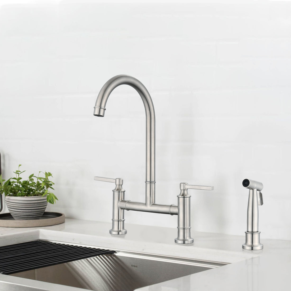 Name: Double Handle Bridge Kitchen Faucet with Side Spray Description: Description: This bridge faucet combines...