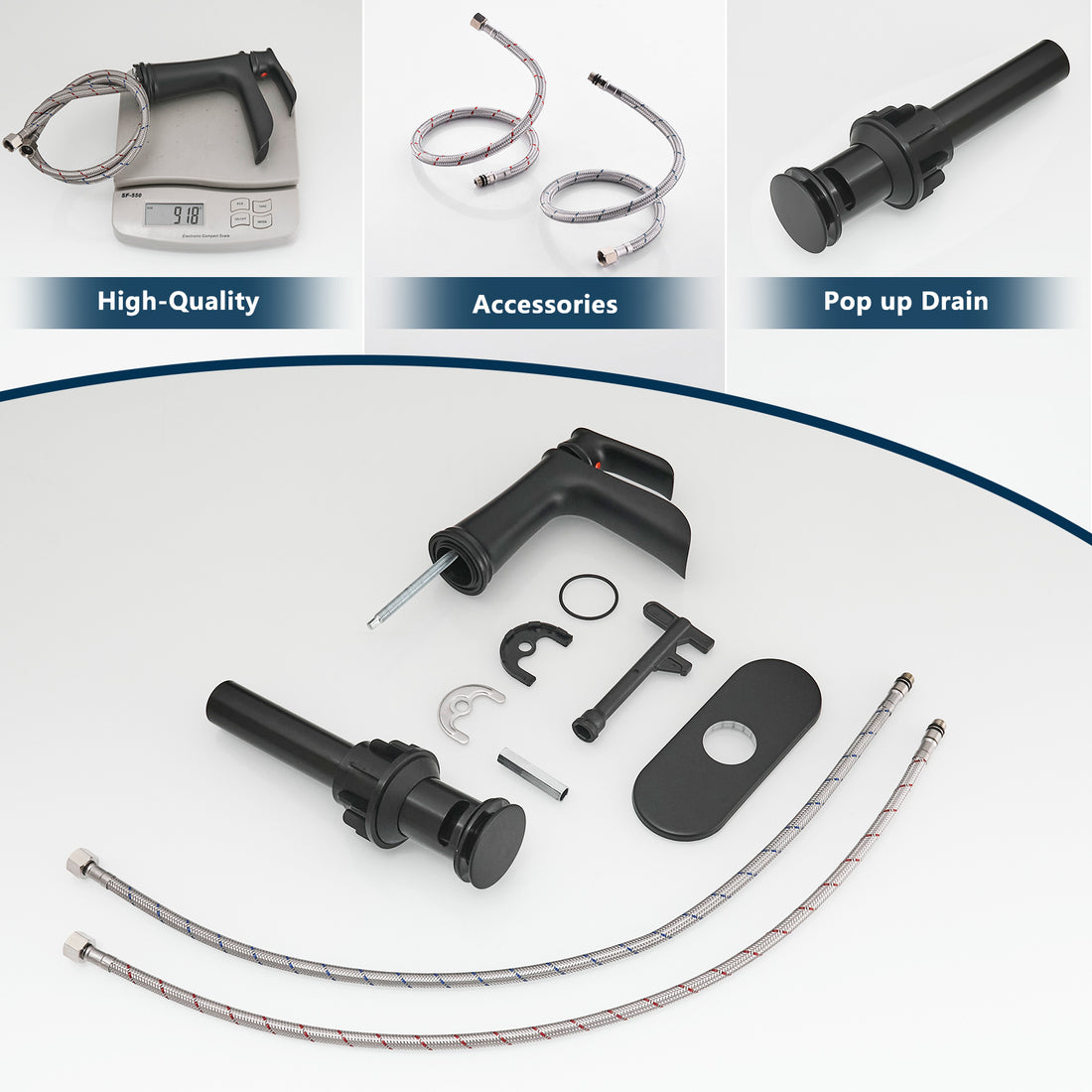 Sink Faucet With Deck Plate Waterfall Black With Pop Up Drain And Supply Lines Bathroom Faucets For Sink 1 Hole Or 3 Holes One Handle Faucets Vanity Bath Mixer Tap Bathroom Joystick Geometric One Black Side Sprayer Deck Mounted Cartridge Valve Single