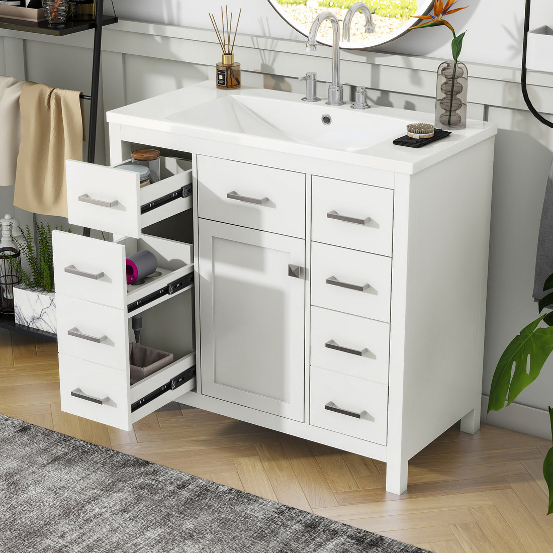 36 Inch Modern Bathroom Vanity Cabinet With Multifunctional Storage Space 5 Drawers And 1 Door White Solid Wood Mdf Resin