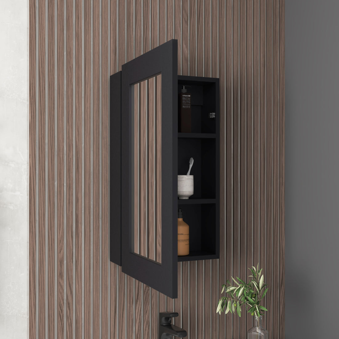 Juno 25.7" H X 15.7" W Narrow Mirror Medicine Cabinet, One Door With Three Interior Shelves For Bathroom, Kitchen Black Black Particle Board