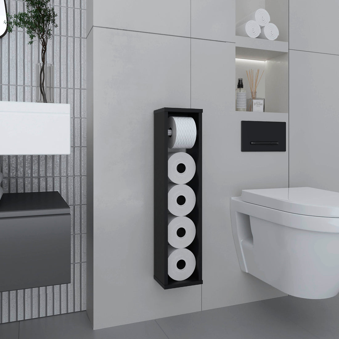 Bali 28" High Toilet Paper Holder Narrow Shelf Organizer For Bathroom, Living Room, Kitchen Black Bathroom Freestanding Modern Particle Board