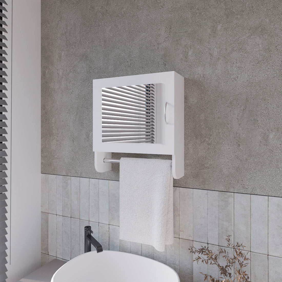 Optim Medicine Cabinet With Towel Holder 17.4" Wide Medice Cabinet Organizer With Two Interior Shelves And Tower Holder For Bathroom, Kitchen, Mudroom White Modern Particle Board