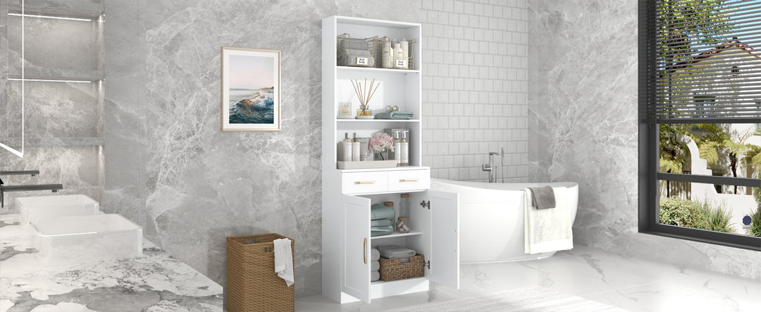 Bathroom Storage Cabinet, Cabinet With Two Doors And Drawers, Adjustable Shelf, Three Layer Open Shelf, Mdf Board, White White Mdf