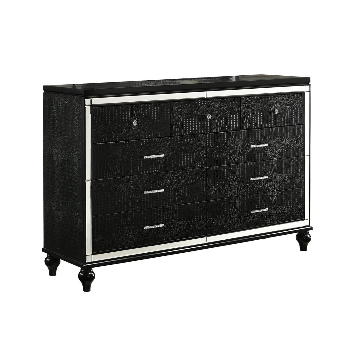 Name: 9 Drawer Wooden Dresser with Embossed Texture and Mirror Accents, Black Characteristics: A single...