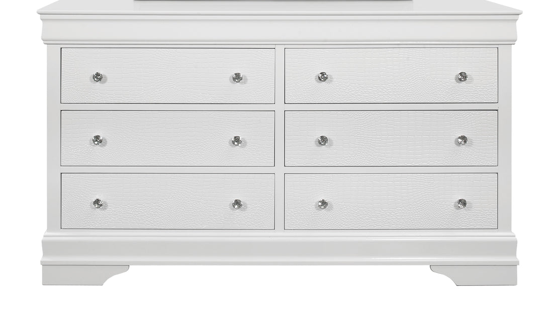 Name: Shaker Crocodile Metallic White DRESSER Characteristics: Crystal Embellished Hardware Textured Detailed Drawer Fronts Contemporary...