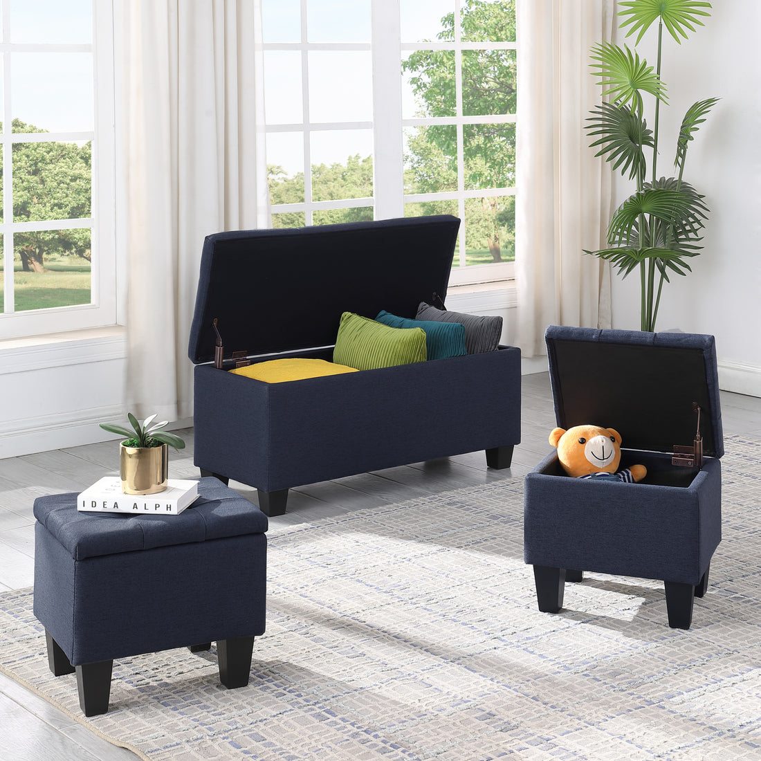 Video Large Storage Ottoman Bench Set, 3 In 1 Combination Ottoman, Tufted Ottoman Linen Bench For Living Room, Entryway, Hallway, Bedroom Support 250Lbs Dark Blue Fabric