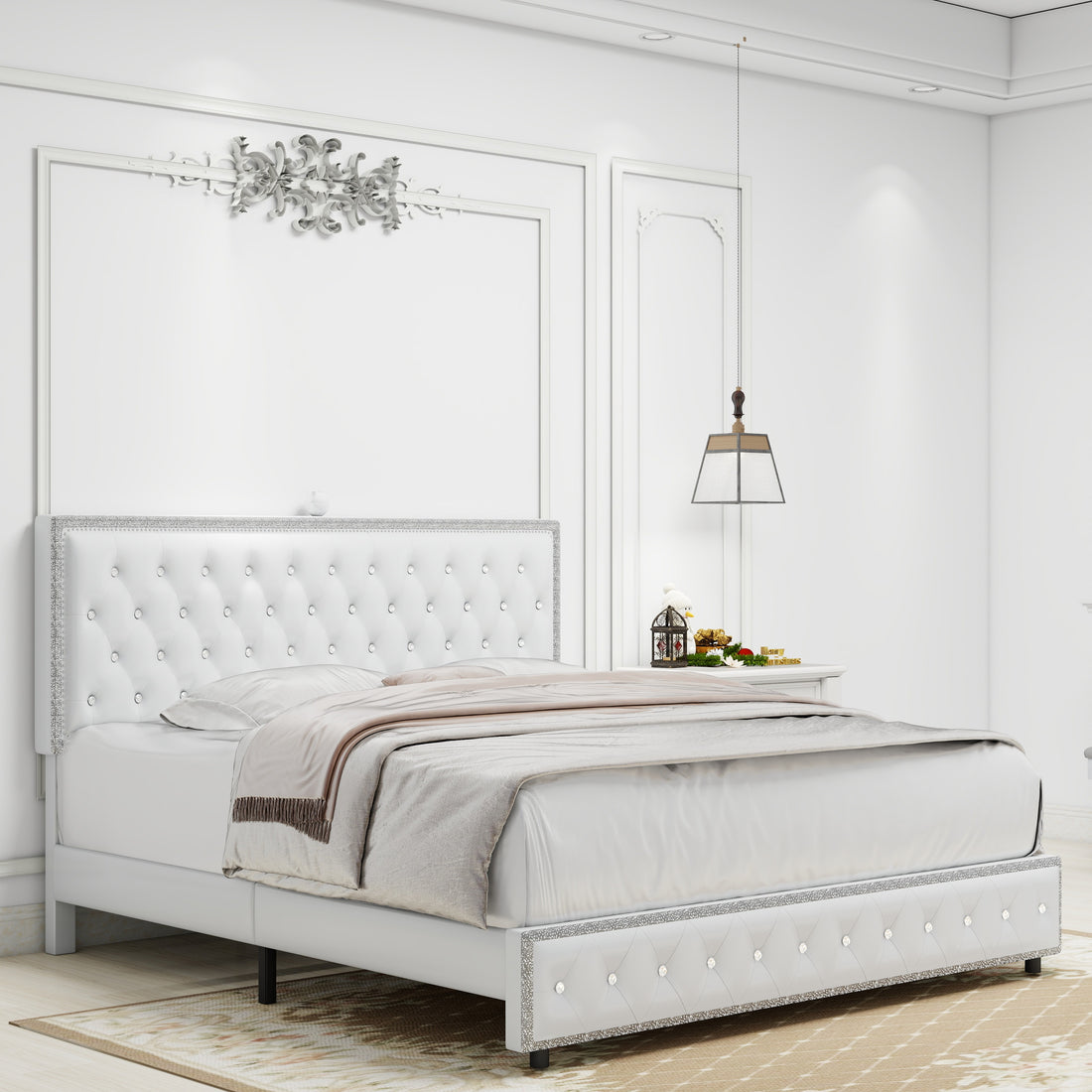 Queen Size Bed Frame With Star Projector Galaxy Light, Adjustable Upholstered Headboard With Diamond Button, Usb Charger, Music Speaker, Pu Leather White Pu Mdf Metal