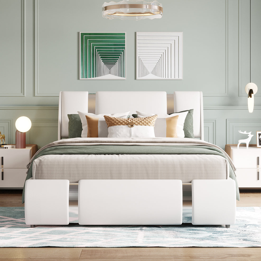 Name: Full Size Platform Bed with Trundle,Storage Headboard and Footboard, Usb Charging Design,White+Green Description: Full...