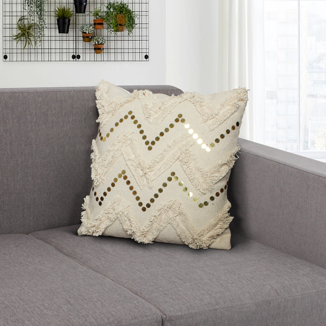 Name: 18 x 18 Square Polycotton Handwoven Accent Throw Pillow, Fringed, Sequins, Chevron Design, Off...