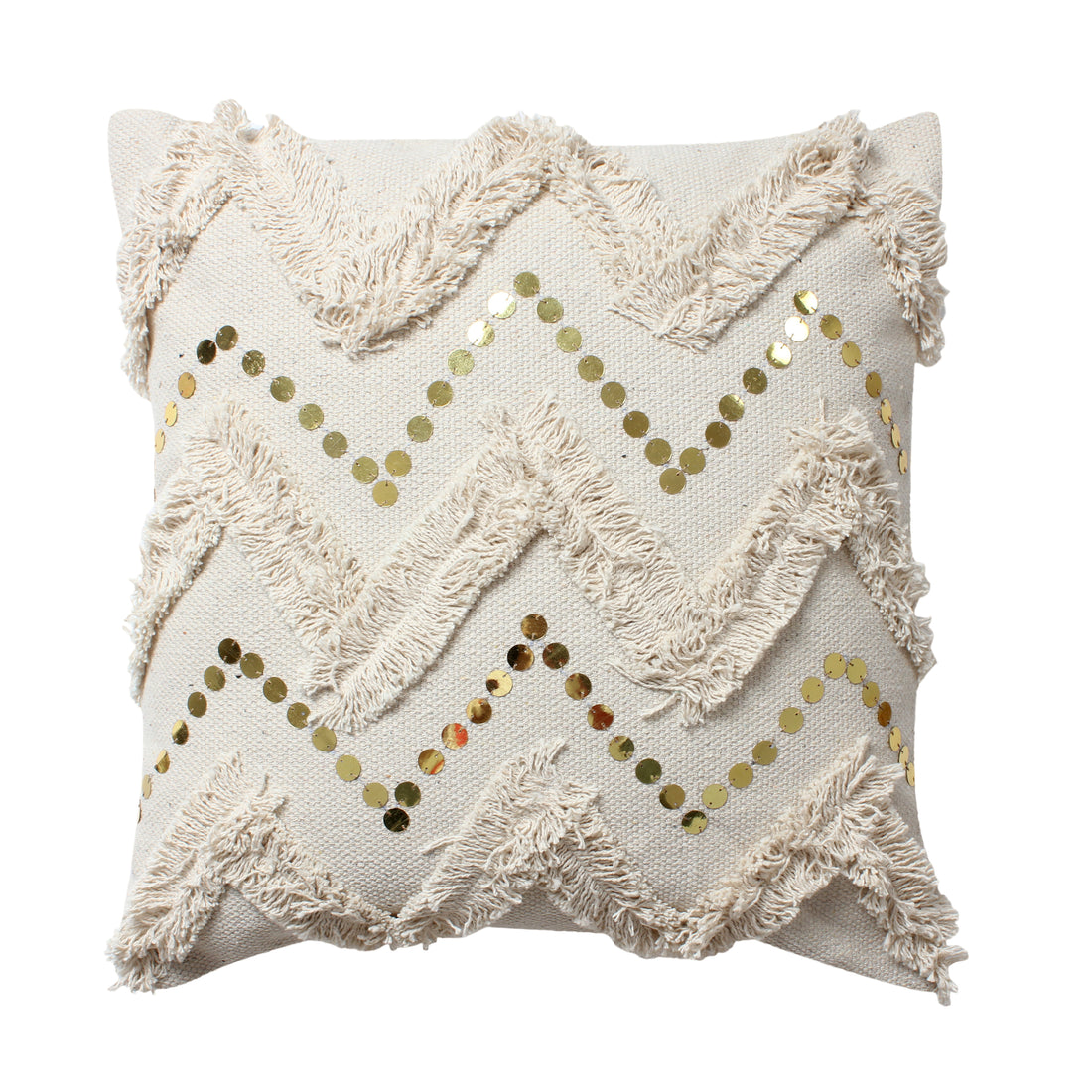 18 X 18 Square Polycotton Handwoven Accent Throw Pillow, Fringed, Sequins, Chevron Design, Off White White Cotton