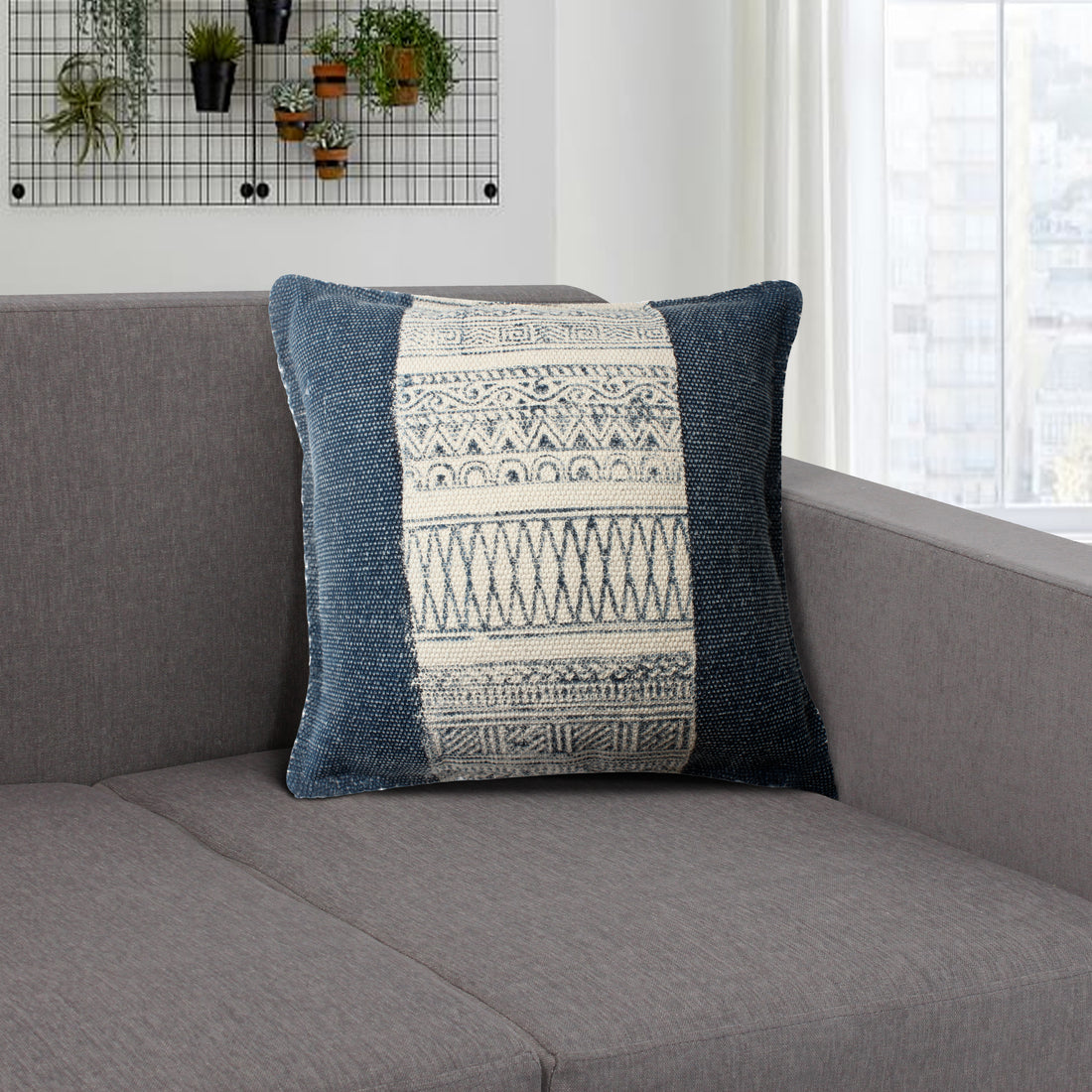 Name: 18 x 18 Square Handwoven Accent Throw Pillow, Polycotton Dhurrie, Kilim Pattern, White, Blue...