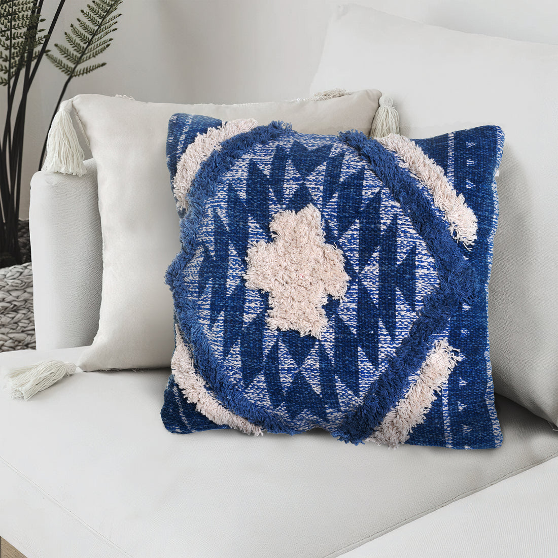 Name: 18 x 18 Handcrafted Square Cotton Accent Throw Pillow, Floral Ikat Dyed Pattern, Fringe...