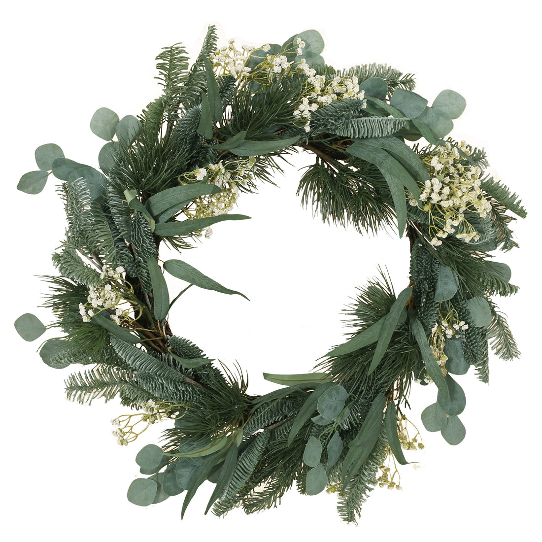 30In Eucalyptus Leaves, Pine Twigs, Stars Wreath White Green Rattan
