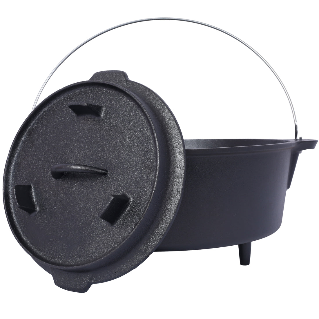Pre Seasoned Cast Iron Dutch Oven With Set Lid, Outdoor Camping Deep Pot For Camping Fireplace Cooking Bbq Baking Campfire, Leg Base, 8 Quart Black Iron