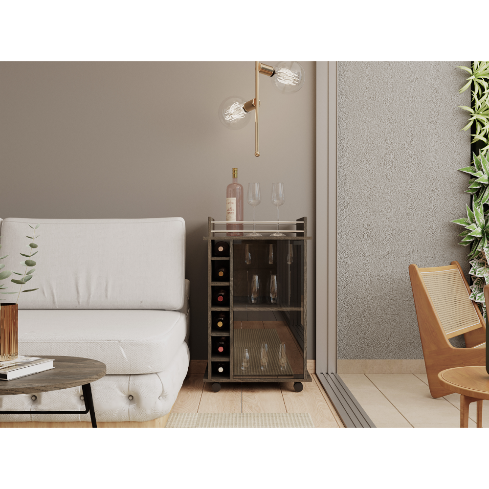 32" H Carbon Espresso Bar Coffee Cart, Kitchen Or Living Room Cabinet Storage With With 4 Wheels, With 6 Bottle Racks, A Central Shelf Covered By 1 Glass Door, 1 Support Surface With Aluminum Front.