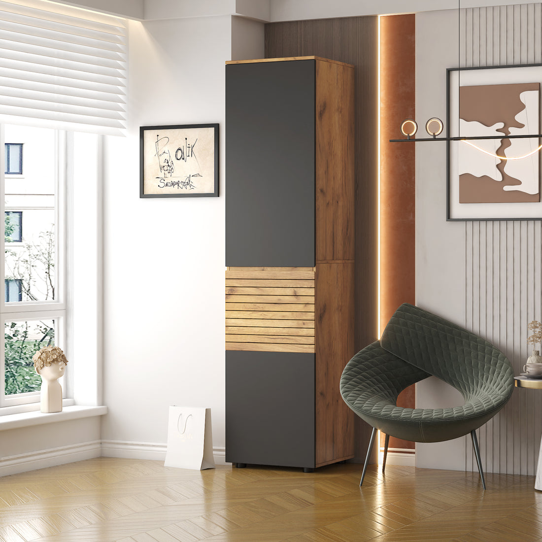 Name: 47.25"Glass Storage Cabinet Floor-to-ceiling for Kitchen, Living Room, Bathroom(Bark blue) Characteristics: Stylish Modern Design:...