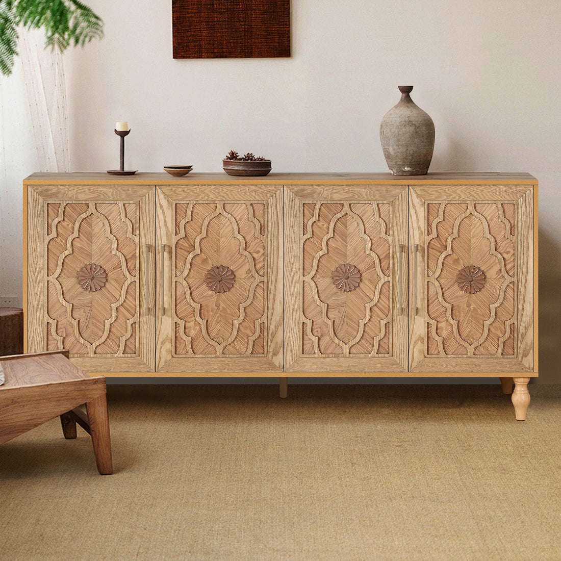 Carved Flower Door Large Storage Cabinet With Metal Handle Suitable For Living Room, Kitchen, Entryway Natural Wood Natural Wood Primary Living Space Mdf