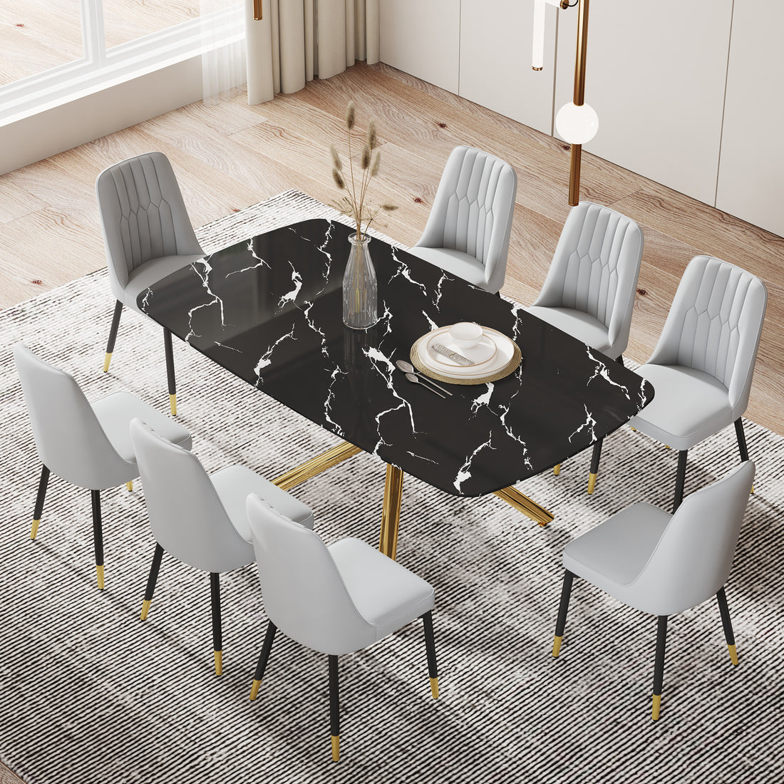 Large Modern Minimalist Rectangular Dining Table With 0.39 "Imitation Marble Black Tabletop And Golden Metal Legs, Paired With Chairs With Pu Cushions And Black Metal Legs. F 1537 C 007 Black Gold Glass Metal