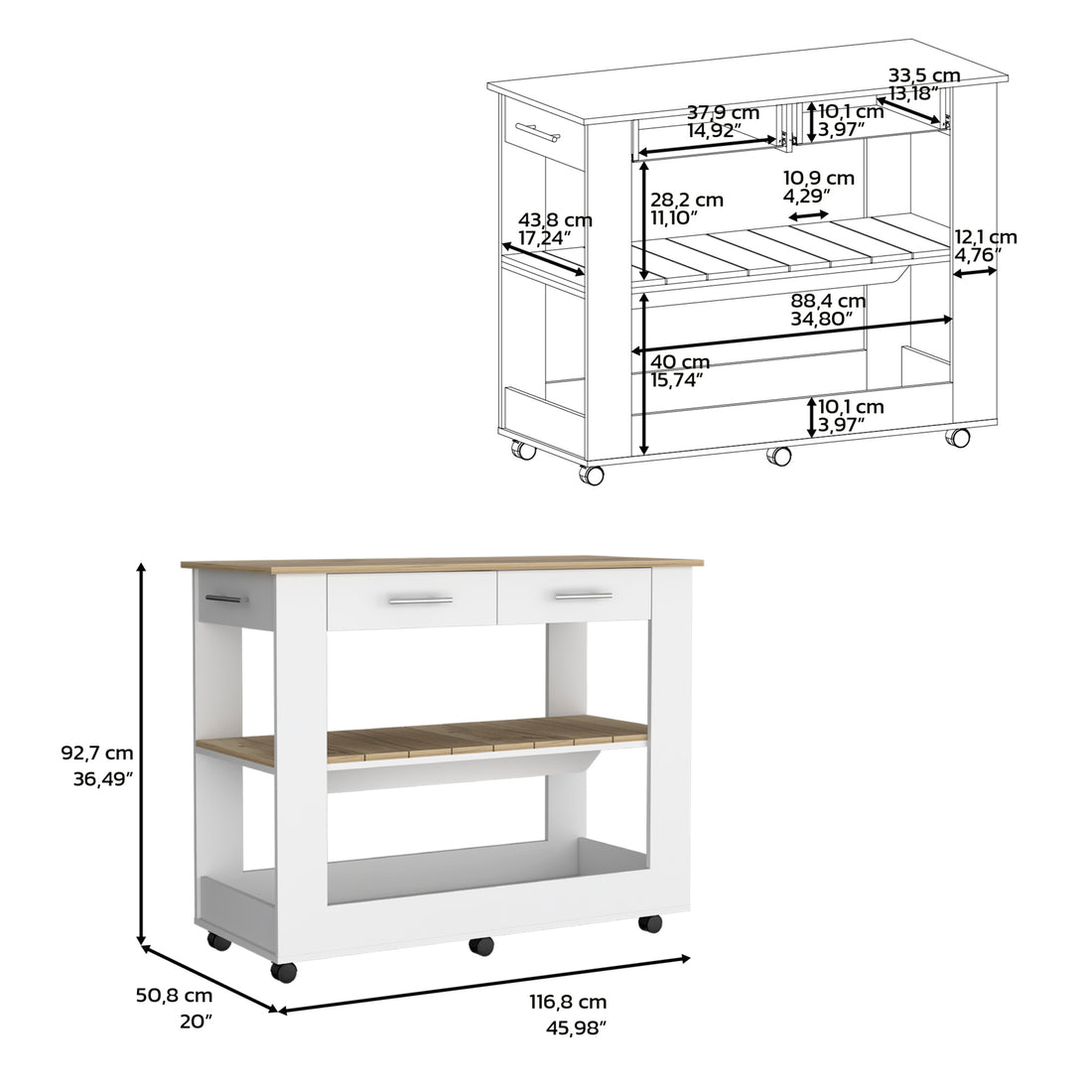 Name: Kitchen Island 46 Inches Dozza, Two Drawers, White / Light Oak Finish Characteristics: Side...