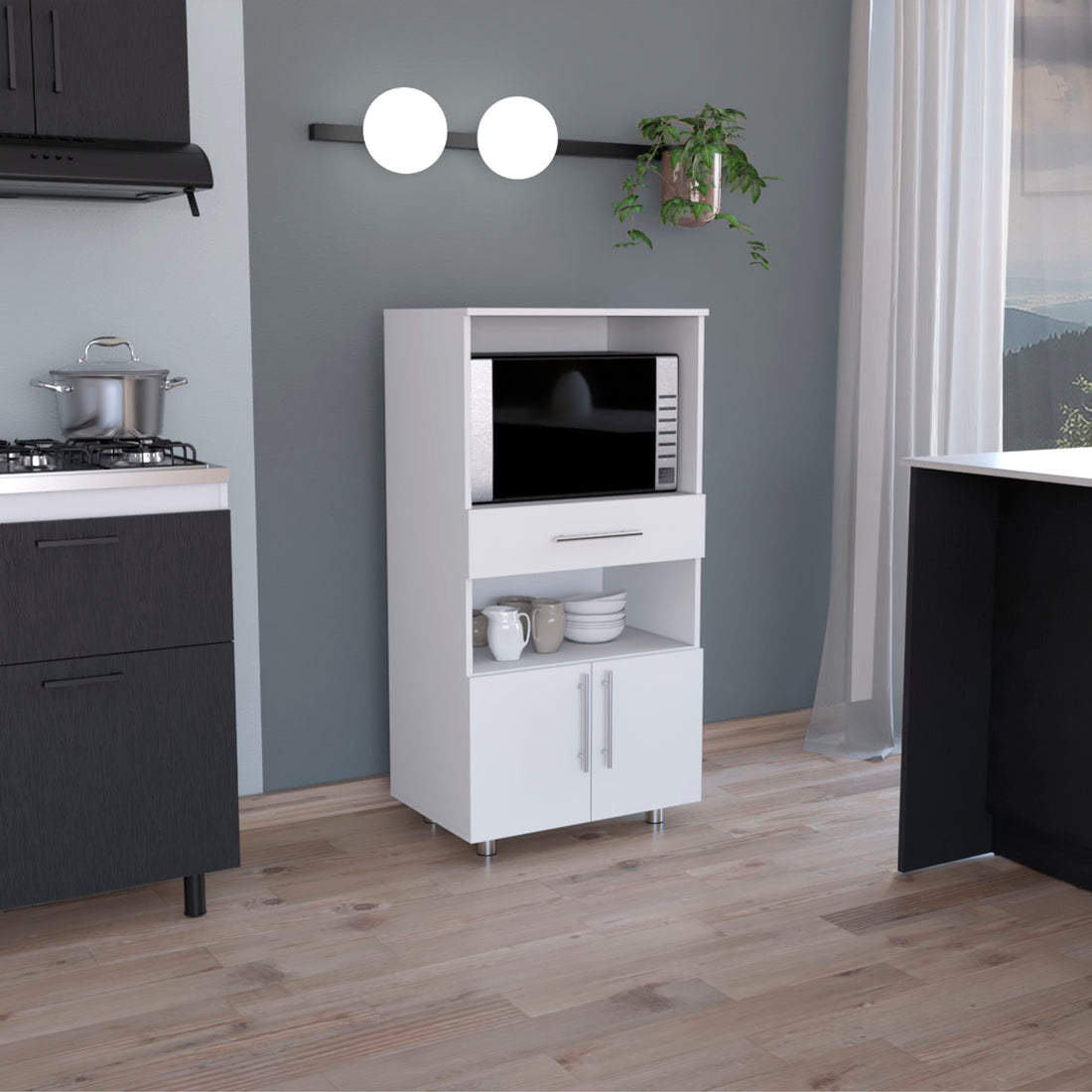 Kitchen Pantry 48" H, Two Open Storage Shelves, One For Microwave, Two Doors, Four Legs, White White Particle Board Pine