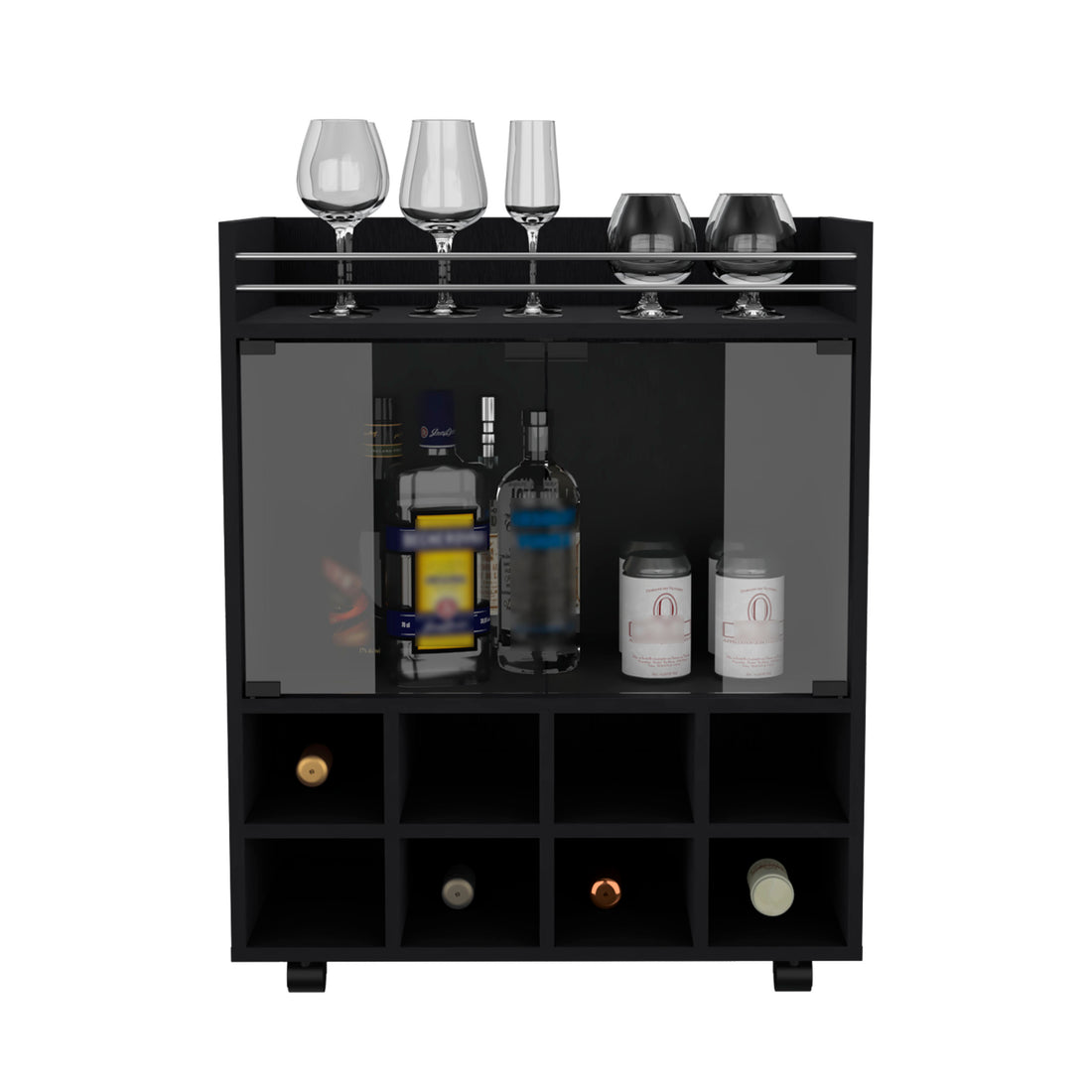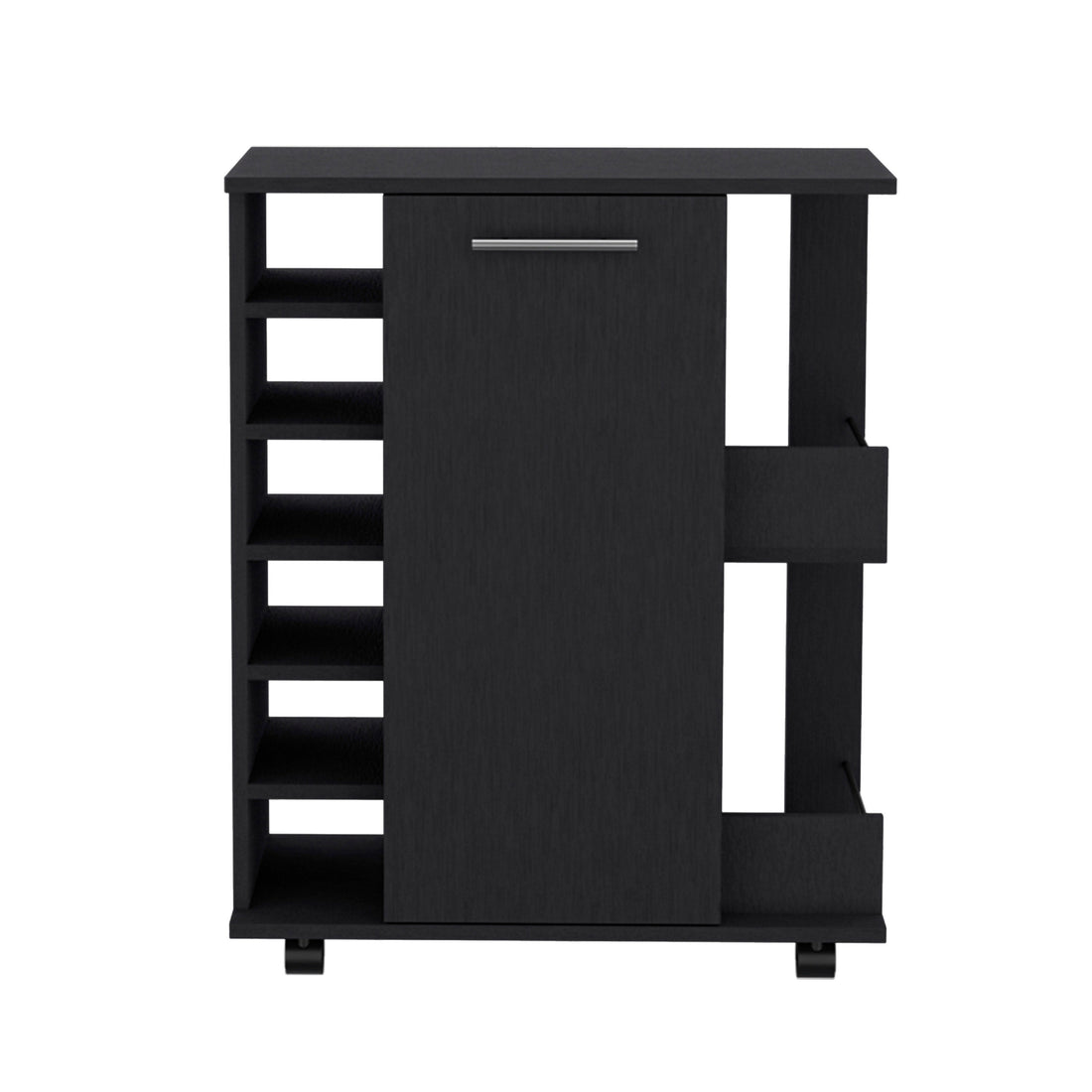 Rawlins Bar Cart With 6 Bottle Rack, Storage Cabine And Mobile Caster Wheels Black Particle Board Engineered Wood