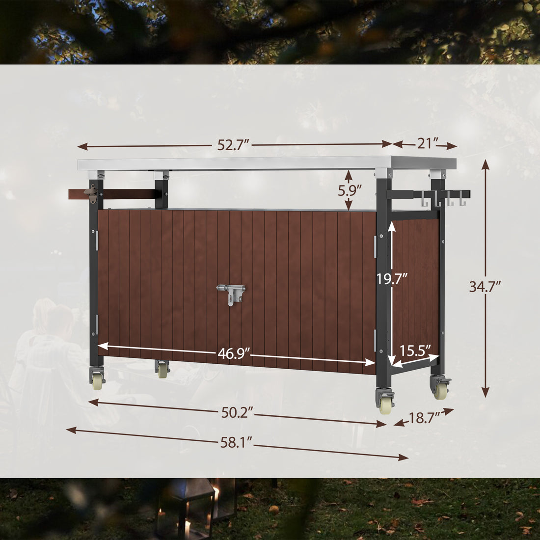 Outdoor Grill Cart With Stainless Steel Tabletop, Storage, Patio Kitchen Island With Wheels, Hooks, And Spice Rack, Waterproof Outdoor Grill Table, Movable Bbq Serving Cart Rolling Bar Cart Brown