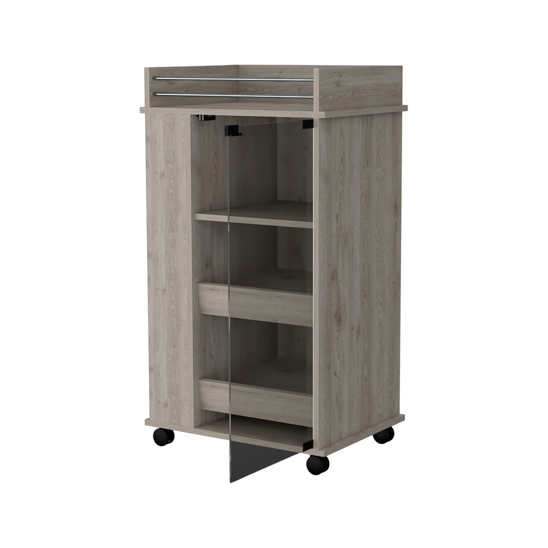 Lusk Bar Cart With 2 Bottle Holder Shelf, Glass Door And Casters Light Gray Particle Board Engineered Wood