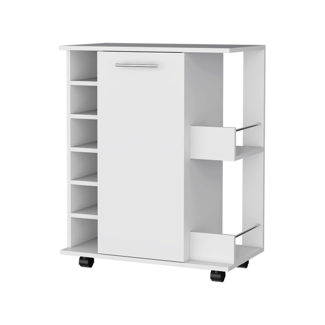 32" H White Bar Coffee Cart, Kitchen Or Living Room Cabinet Storage With 4 Wheels, With 6 Bottle Racks, A Central Shelf Covered By 1 Door, Ideal For Storing Glasses And Snacks White Particle Board