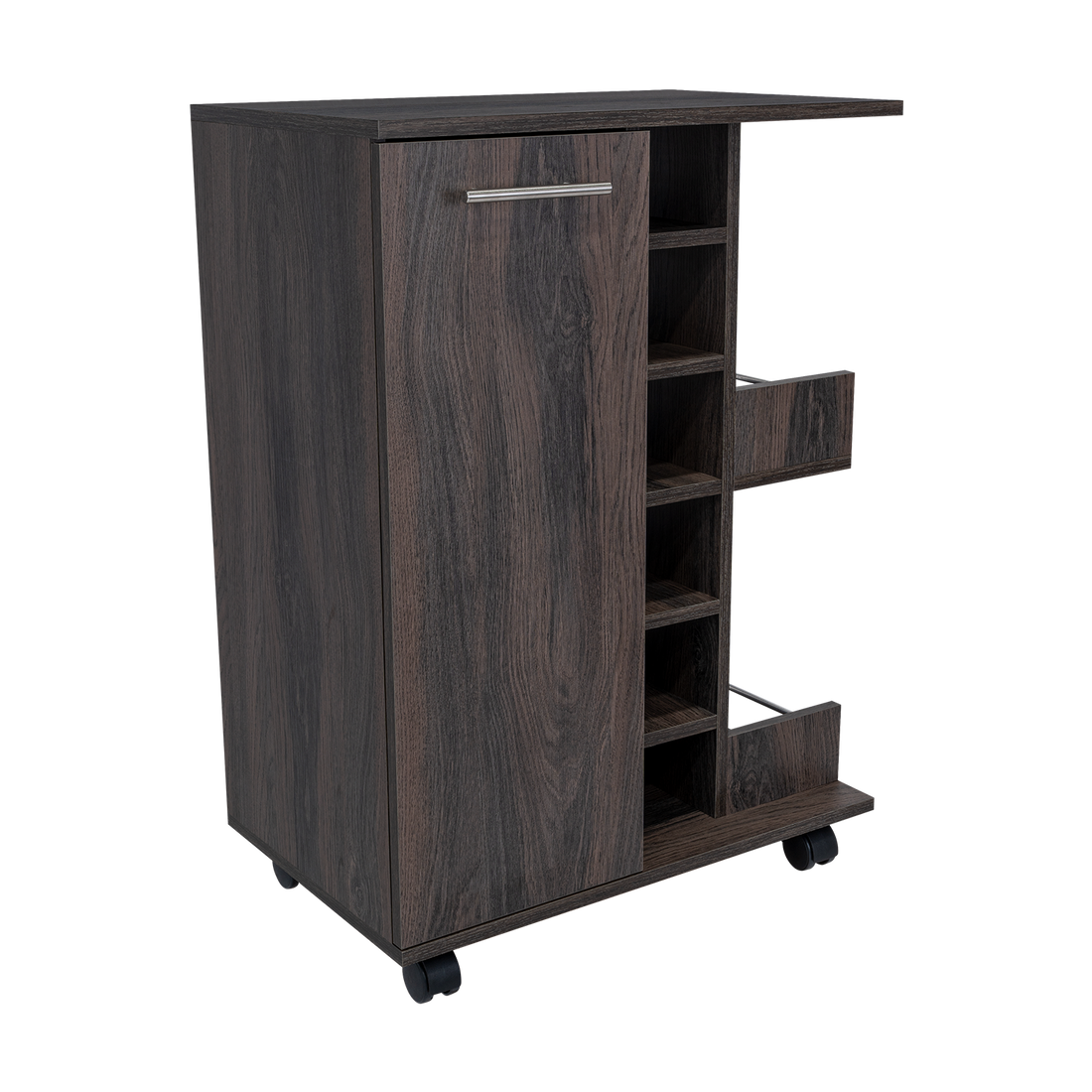 Bar Cart, Two External Shelves, Four Casters, Six Built In Wine Rack, Single Door Cabinet Espresso Brown Primary Living Space Particle Board Particle Board