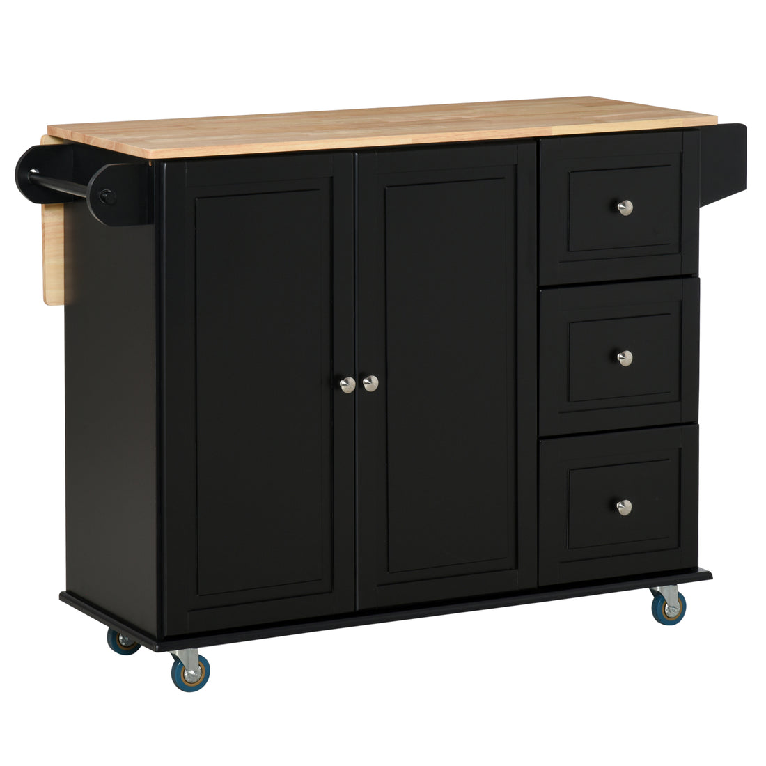 Homcom Rolling Kitchen Island With Storage, Kitchen Cart With Wheels And Wood Countertop, Utility Cart With 2 Drawers, 3 Cabinets, Towel Rack And Spice Stand, Black Black Rubber Wood