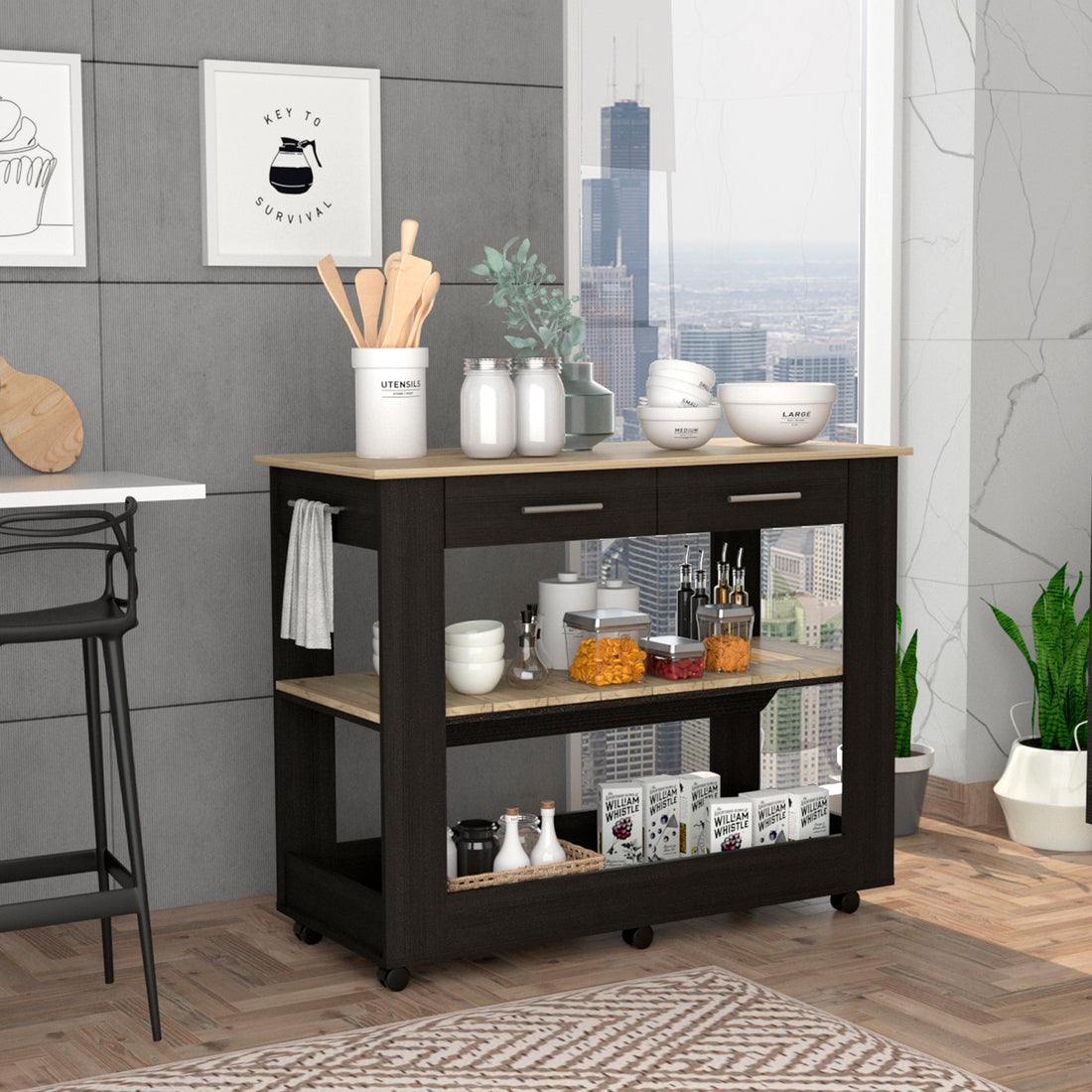 Name: Cala Kitchen Island 46, Six Casters, Two Drawers, Lower Open Shelf -Black / Light...