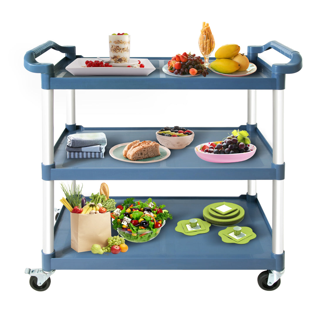 3 Tier Plastic Service Utility Cart With Wheels, Food Service Rolling Cart Heavy Duty 350Lbs Capacity,Commercial Rolling For Restaurant, Household, Office, Warehouse, 40.9''L X 19.6''W X 41.3''H Blue Polyethylene,Pvc