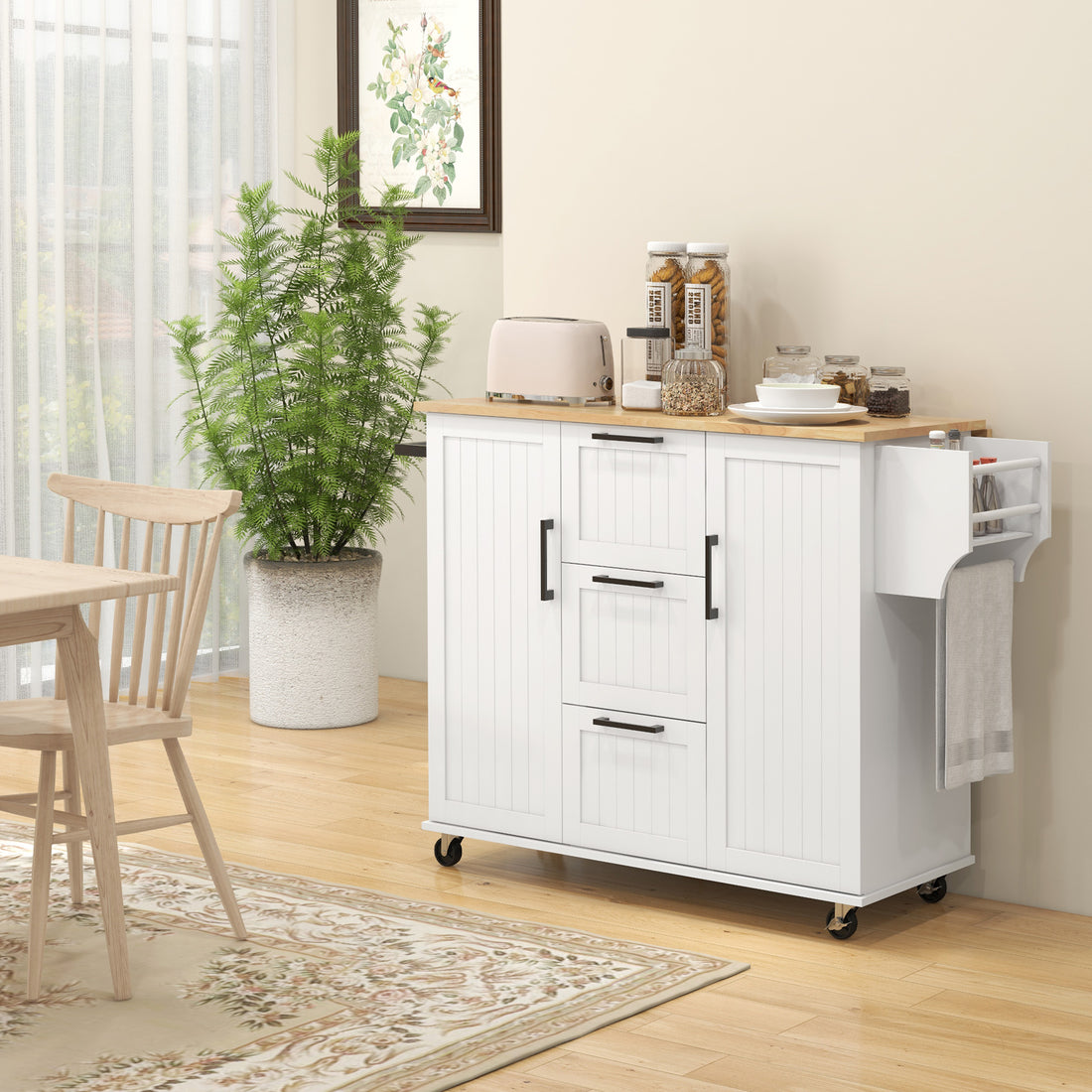 Homcom Kitchen Island With Drop Leaf, Rolling Kitchen Cart On Wheels With 3 Drawers, 2 Cabinets, Natural Wood Top, Spice Rack And Towel Rack, White White Rubber Wood