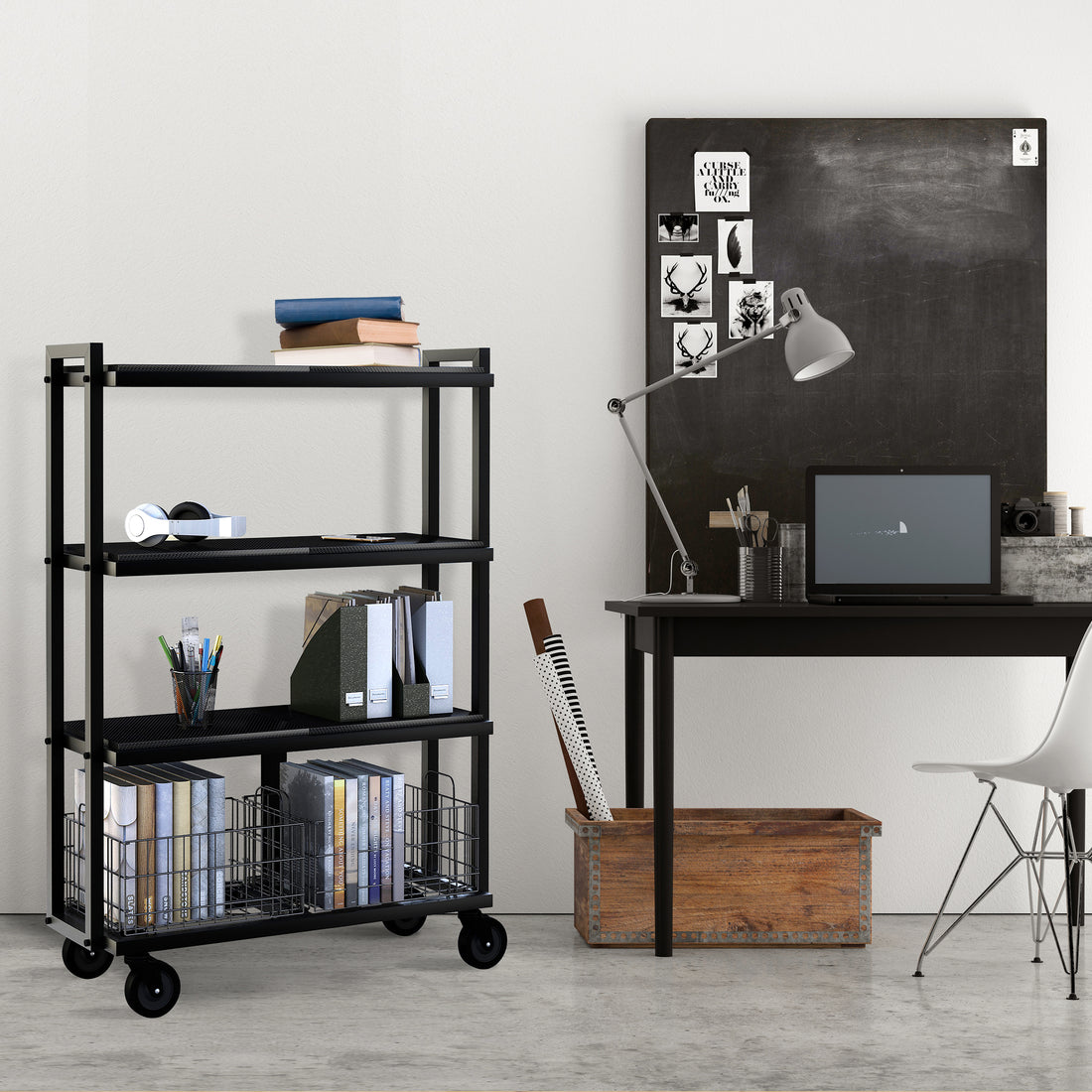 4 Tier Cart, Interchangeable Baskets And Shelves, Caster Wheels, Powder Coated Metal In Black Black Metal